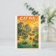Travel poster featuring Cat Ba Island, Hai Phong, Vietnam, in a classic retro travel-poster style. Central focus on the dramatic limestone karsts rising from emerald waters of Lan Ha Bay, with hidden beaches, floating fishing villages, and small wooden boats drifting between the islands. Lush tropical forests cover the cliffs while soft golden sunset light reflects across the calm sea, creating a tranquil and adventurous coastal atmosphere. Rich color palette of jade green water, limestone gray, tropical green, and warm sunset gold. Clean graphic illustration with subtle vintage grain texture. Bold vintage typography headline: “CAT BA – GATEWAY TO LAN HA BAY”. Vertical 2:3 layout, high-resolution, print-ready.