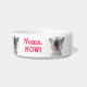 A LOL cat bowl for hungry and demanding felines, featuring our very own cream Burmese, Kate. Images of Kate yelling for food are interspersed with the words in pink "Noms. NOW!"