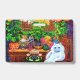 Badge featuring Louis Wain’s animal painting Master of Cat College (1860-1939). A thoughtful white cat with striking blue eyes sits ponderously next to a vibrant assortment of beautiful flowers. The majestic cat college looms in the background underneath a pink and blue sky. A wonderful gift for cat lovers and English art.