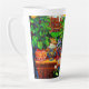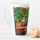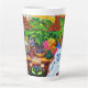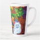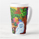 Latte Mug featuring Louis Wain’s animal painting Master of Cat College (1860-1939). A thoughtful white cat with striking blue eyes sits ponderously next to a vibrant assortment of beautiful flowers. The majestic cat college looms in the background underneath a pink and blue sky. A wonderful gift for cat lovers and English art.