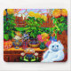 Mouse Pad featuring Louis Wain’s animal painting Master of Cat College (1860-1939). A thoughtful white cat with striking blue eyes sits ponderously next to a vibrant assortment of beautiful flowers. The majestic cat college looms in the background underneath a pink and blue sky. A wonderful gift for cat lovers and English art.