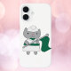 Are you a fan of cats? You'll love this phone case featuring a cute gray cat wearing a green and white color guard uniform while holding a green flag.
