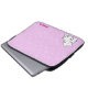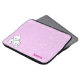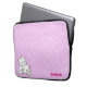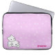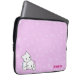 A laptop sleeve with a fun pattern and a cute cartoon cat couple. It has a pink background with white swirls. In the left corner it has a boy and girl cartoon kitten snuggling. In the right corner you can customize your name.