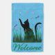 Cat silhouette in black with colorful dragonflies, cattail plants and "Welcome" text on a blue background.
