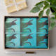 A black cat silhouette with dragonflies and cattail plants on a blue & green background.