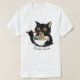 This white t-shirt features a humorous graphic of a black cat enthusiastically eating ramen noodles from a bowl with chopsticks. The design captures the cat's enjoyment of the meal in a detailed, cartoon style. Perfect for cat lovers and ramen enthusiasts, this casual wear adds a fun and quirky touch to any outfit.