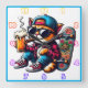 A cool cat relaxes with a drink and cigar, wearing sunglasses and a flannel shirt, beside a colorful skateboard adorned with flowers.
