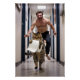 A cat flees on two legs with a roll of toilet paper in the paws, while a man in the background is running desperately behind her.
