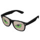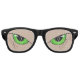 A green cat eye on each perforated flesh colored 'lens' on black Wayfarer designer party frames.