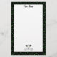 This personalized stationery is white with a black border having bright green polka dots with an ink drawing of a cat face at the bottom with long whiskers and vibrant green eyes. Customize your name at the top with the template.