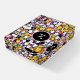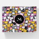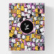 A fun doodle illustration of the faces of cats edged with a bold black outline. There are grey, black, orange and white kitties with pointed ears wearing tees huddled up next to each other in a collage seamless, repeating pattern that has a black circle edged with pale pink in the middle on which a white template for your monogram or initials appear. This watercolor comic style ai graphic is the perfect gift for cat lovers.