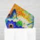 Tissue Paper featuring Louis Wain’s animal painting Cat Flower Eyes (1860-1939). A rainbow cat widely grins. Blue flowers cover his eyes. A wonderful gift for cat lovers and English art.