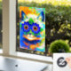 Window Cling featuring Louis Wain’s animal painting Cat Flower Eyes (1860-1939). A rainbow cat widely grins. Blue flowers cover his eyes. A wonderful gift for cat lovers and English art.