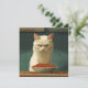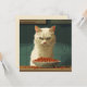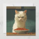The image depicts a white cat with a serious, almost displeased expression, staring intently at a full bowl of cat food in front of it. The background features dark green tiles, adding to the focused and slightly dramatic mood. The cat's fur is detailed, and its green eyes are narrowed, giving it a strong, commanding presence. The overall style is reminiscent of vector art, with clean lines and bold colors.
