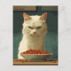 The image depicts a white cat with a serious, almost displeased expression, staring intently at a full bowl of cat food in front of it. The background features dark green tiles, adding to the focused and slightly dramatic mood. The cat's fur is detailed, and its green eyes are narrowed, giving it a strong, commanding presence. The overall style is reminiscent of vector art, with clean lines and bold colors.