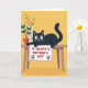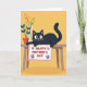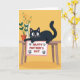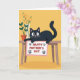 This card shows a sleek black cat stretched across a rustic wooden tabletop, its wide white eyes and small smile giving it a cozy, affectionate look that feels like a gentle nuzzle ❤️. The cat’s curved tail and relaxed paws draw your gaze toward a white placard tucked beneath its body, as if it’s guarding a sweet note. Centered on the placard, the words “Happy Mother’s Day” appear in warm red lettering, with a thin pink border framing the message. Small charcoal-gray paw prints sit around the text, adding a friendly, companionable touch without stealing the focus. To the left side of the table, a slender vase holds three orange flowers with pale centers, and a small pot nearby shows deep green, heart-shaped leaves 🌼. The background is a soft buttercup yellow that makes the whole scene feel sunny and welcoming, while light shadows under the table and objects add depth. The front design shows the cat’s body spanning the tabletop, with the vase and plants grouped on the left and the bordered placard centered beneath the cat.