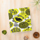 An original and whimsical design featuring a garden like composition with stylized plants and flowers and a little black cat curled up in the grass.