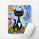 Cute black and white kitty cat with a white love heart on her chest and bright green eyes sitting in some long green grass. She is surrounded by lots of pretty colourful flowers. Leaves and tiny flowers are floating all around her and a butterfly flutters around her head. Digital abstract folk art designed by C.Katt.