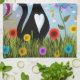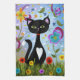 Cute black and white kitty cat with a white love heart on her chest and bright green eyes sitting in some long green grass. She is surrounded by lots of pretty colourful flowers. Leaves and tiny flowers are floating all around her and a butterfly flutters around her head. Digital abstract folk art designed by C.Katt.