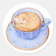 Illustration of a ginger tabby cat curled up cosily in a coffee or tea cup. Distinctly imaginative and perfect for lovers of all things feline, or related to coffee or tea cups!