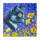 Tile featuring Louis Wain’s animal painting Cat in Sea of Flowers (1860-1939). A black and white cat with golden eyes smells yellow flowers. In the purple background are blue flowers. A wonderful gift for cat lovers and English art.