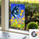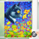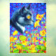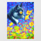 Window Cling featuring Louis Wain’s animal painting Cat in Sea of Flowers (1860-1939). A black and white cat with golden eyes smells yellow flowers. In the purple background are blue flowers. A wonderful gift for cat lovers and English art.