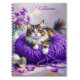 A Personalized notebook with a sweet kitty cat sitting on a ball of purple yarn and next to a purple vase of flowers.