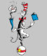 This classic Dr. Seuss graphic features Cat in the Hat balancing on a ball with a book, umbrella and fish.