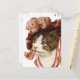 Vintage illustration of a white and brown cat dressed in a red Victorian hat with feathers