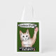 This Reusable Grocery Bag features a cat activist, in the original illustration and design by ZoeSPEAK. The cute kitty is a member of the adVENTURE CATiPAList SOCIETY, and she is holding up her paw with a sign which reads “CATiPALists for CAT LADIES!”. Over her chest are the words “Being Green”, which is optional text for you to change or delete if you prefer. The background is dark green. She is serious. If your cat is your pal, this design’s for you.