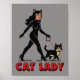 She struts her stuff in a sassy catsuit, complete with kitty ears, as she walks her grumpy tuxedo cat on a leash. The bold red "Cat Lady" text pops on the gray background of this comic themed graphic. Show off your love for cats, while poking fun at the cat lady label, with this unique poster art.