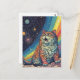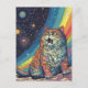 An adorable cat is meowing at finding itself in outerspace with a rainbow behind it