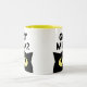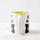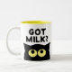 Cat Milk? funny cat meme coffee mug gift for pet owner. Cute white cup with kitty cartoon and humorous quote. Fun gift idea for animal lover, cat owner, cat person, cat dad, pet lover etc. Yellow or custom color on the inside. Funny cat silhouette with big yellow eyes.