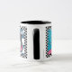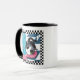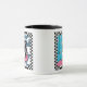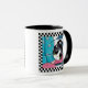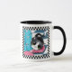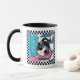 This mug design features a tuxedo cat resting his head on his owners feet while she makes breakfast. The image is surrounded by a black and white checked border and appears on both sides of the mug. Copyright © Lisa Marie Robinson. All rights reserved.