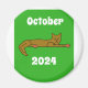 A brown cat is lying down comfortably on a round magnet that has a white and green color scheme. The cat has medium-brown fur, appearing relaxed with its body slightly curled. The magnet underneath features the words "October 2024" clearly visible, and the green and white colors create an attractive contrast. The overall scene is calm and cozy, with the cat resting on the smooth surface of the magnet.