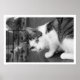 Greyscale photograph of a tabby -and-white cat on a window ledge, with eyes focused intently on a bird.