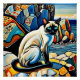 A.I .created print of a stylized Siamese cat with striking blue eyes sits among vibrantly colored rocks by the sea.
