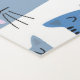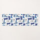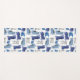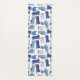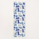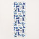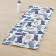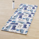 A yoga mat with a pattern of blue and gray cats on a white background, next to a white-water bottle, on a light wood floor. The cats are in various poses, such as lying down, stretching, and sitting. The pattern is dense and covers the entire mat. The water bottle is tall and cylindrical, with a black cap. The floor is made of light-colored wood planks. The lighting is bright and even. The style is cartoonish.