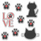 This sticker sheet features a black cat, a cat head with whiskers, six black paw prints with red hearts in the center, and the word love with a paw print.