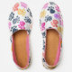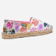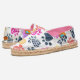 The cute pattern on these espadrilles is of various colored and patterned cat paw prints. Colors include red, dark navy blue, gold and violet pink. The colorful prints are placed on a white background. Fun!