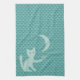 Gifts for cat lovers with playful kitty playing with a star hung from the moon on teal pattern background.