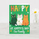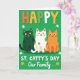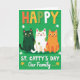 This card features an emerald green background with “HAPPY” across the top in chunky, slightly uneven letters shaded in orange, yellow, and spring green 💚. Centered below, three stylized cats sit shoulder to shoulder as if posing for a close friends’ photo: a deep forest green cat with faint spots, a white cat with olive polka dots, and an orange tabby with coral speckles. Their wide eyes and small smiles seem to glance toward one another, giving the lineup a cozy, affectionate feel. Beneath the cats, the pun “ST. CATTY’S DAY” appears in large white text, easy to spot at a glance. Just under that, “Our Family” is written in a flowing white cursive line, tucked neatly into the lower area like a gentle tag. Scattered around the scene are small white shamrocks and simple golden four‑petaled flowers, adding a festive touch ☘️. The cats sit in a tidy row while the shamrocks and flowers dot the green field around them in an even, airy pattern.