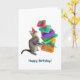 A tabby kitten carries a big stack of wrapped presents on this funny birthday card.