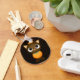 This cute keychain features a Halloween cat dressed in a pumpkin costume. It is an original, one of a kind design from Janay Green's Greeting Cards.