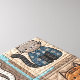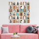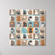 Colorful quilted squares feature various cats with different patterns and colors each sitting against a unique background