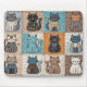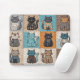 Colorful quilted squares feature various cats with different patterns and colors each sitting against a unique background