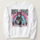 Rock Band Cat T-Shirt - A must-have for music lovers! This unique band t-shirt combines rock music with an adorable cat design. In the center, a blue-eyed cat wearing sunglasses is illustrated holding a guitar and making rock and roll hand gestures. In the background is a pink and black circular pattern of stars and stripes that gives the whole design an energetic vibe.