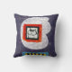 A funny cat illustration over a purple and white background with yellow and black stripes on blue.
