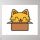 Playful cute and funny orange cat sitting inside cardboard box smiling