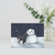 this postcard features an illustration of a cute black cat nuzzling up to a cat shaped snowman! the background is a starry winter sky, dark blue and full of stars - most notably the big dipper - which is part of the ursa major constellation!